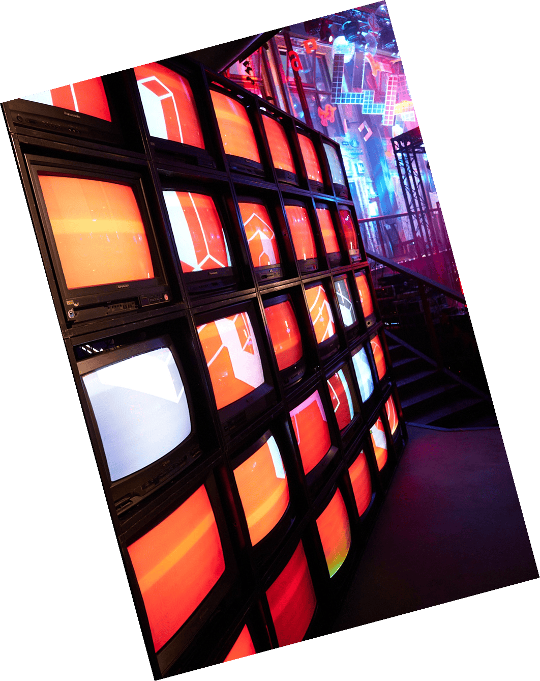 Количество телевизоров в фотозоне соответствует главному числу юбилея. Их ровно тридцать, хотя не многие это сразу замечают. На селфи создается ощущение, что экраны уходят в бесконечность. Изображение на каждом телеке то бьется на тридцать одинаковых элементов, то собирается в единую картинку во всю стену. Никогда не знаешь, на каком именно фоне получится сфоткаться.