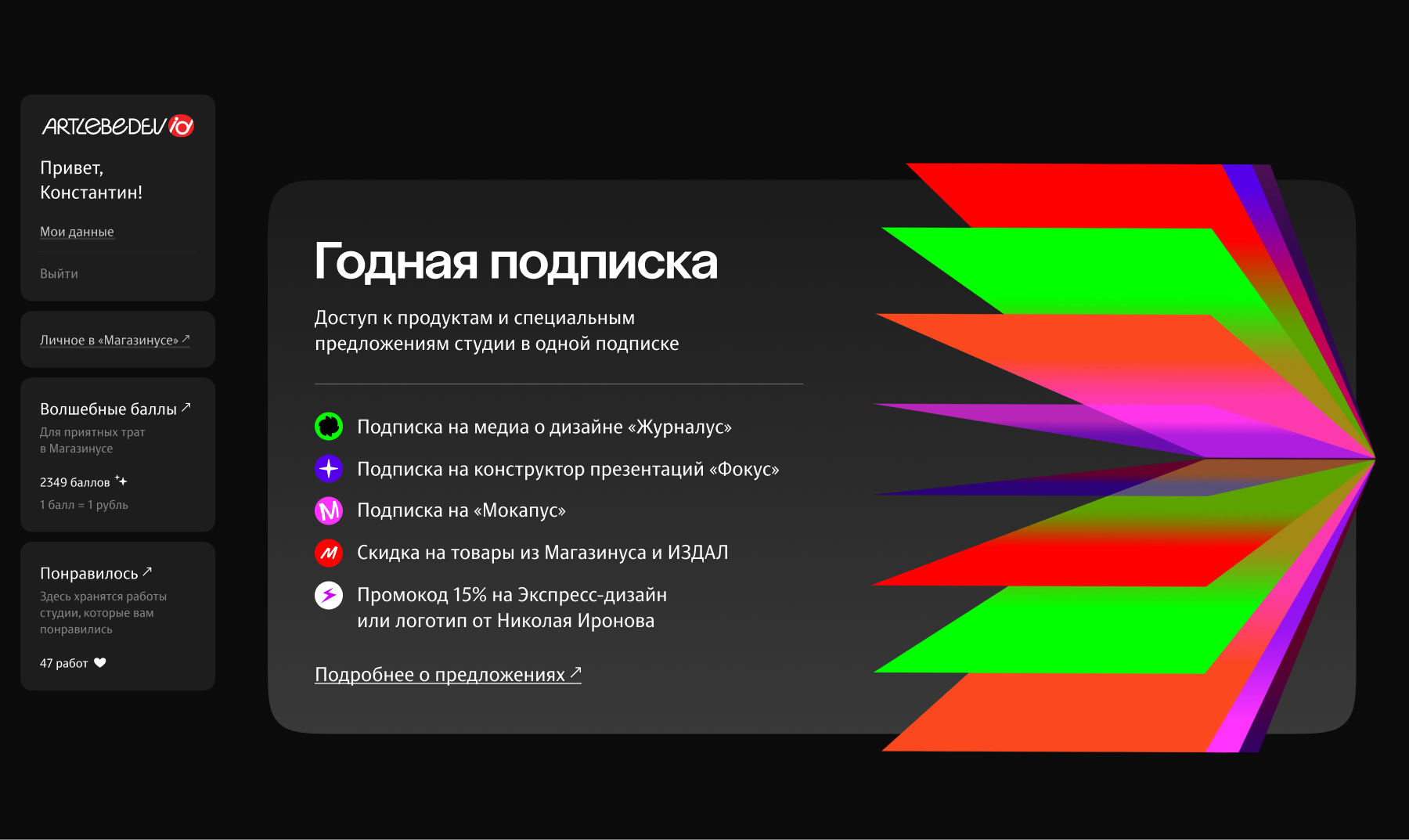 Ежедневно сайт студии посещают тысячи человек для решения разных задач: они совершают покупки в «Магазинусе», оформляют подписку на наши полезные сервисы и заказывают дизайн. Чтобы людям было приятно и комфортно взаимодействовать с сайтом, мы создали «Артлебедев ай-ди» — персонализированную витрину для быстрого доступа ко всем нашим продуктам.