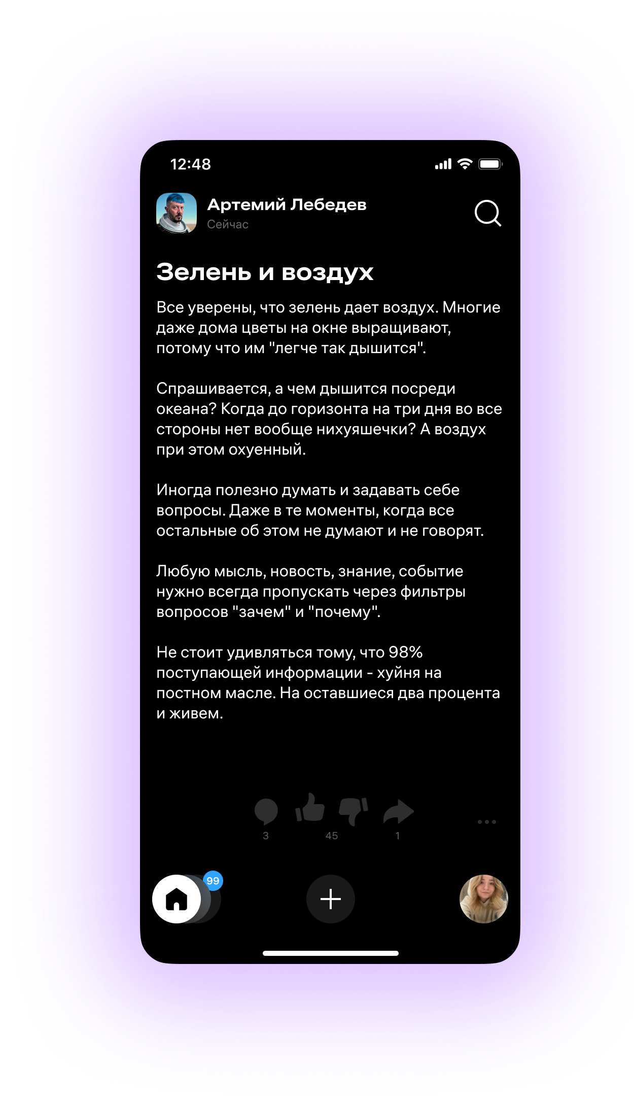 Механика «Диома» привычна каждому обитателю соцсетей. Любой контент — текст, изображения, видео — растягивается на весь экран, полностью занимая доступное пространство и привлекая еще больше внимания.