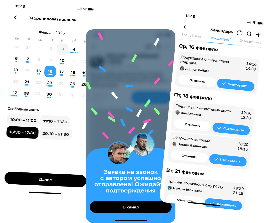 Тот, кто хочет пообщаться с авторами напрямую, ищет свободные слоты в их расписании и бронирует звонки напрямую. Так важный разговор точно состоится.
