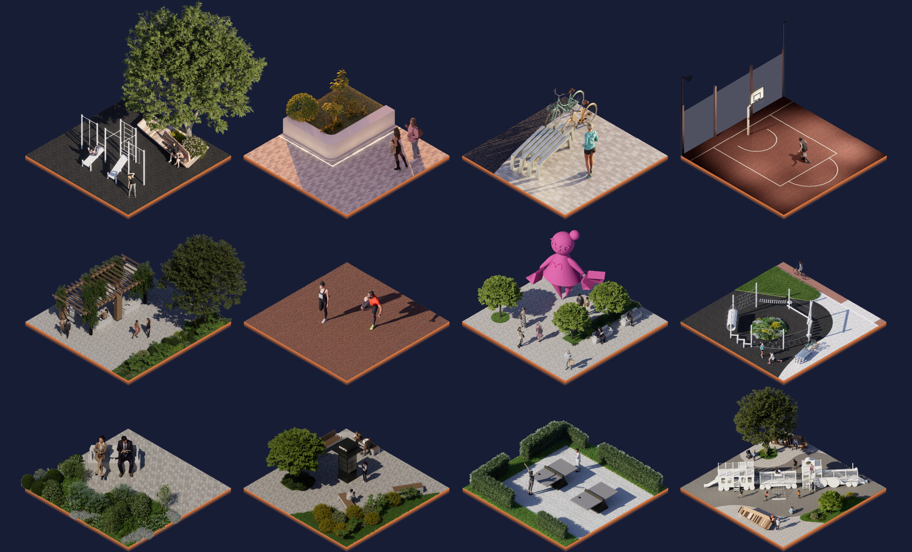 Территория быта не рассчитана на неспешные прогулки. Обычно жители быстро проходят ее насквозь, образуя основной вектор пешеходного движения. Все благоустройство зоны подчеркивает угловатую форму территорий нижней части градиента.