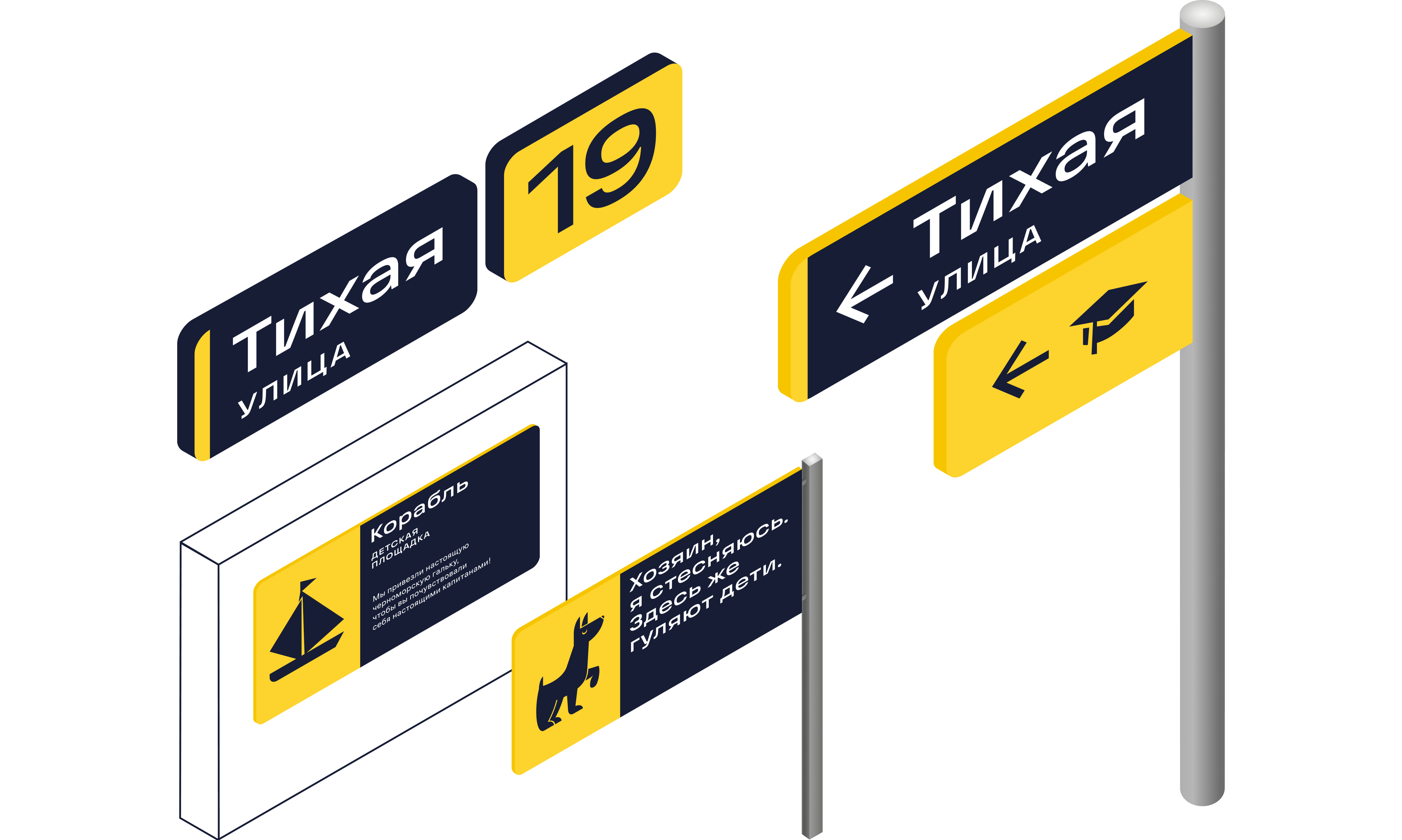 В Мириадах используются три типа навигационных носителей: адресные и информационные таблички, а также навигационные указатели. На страницах дизайн-кода описаны их допустимые размеры, компоновка и всевозможные сочетания.