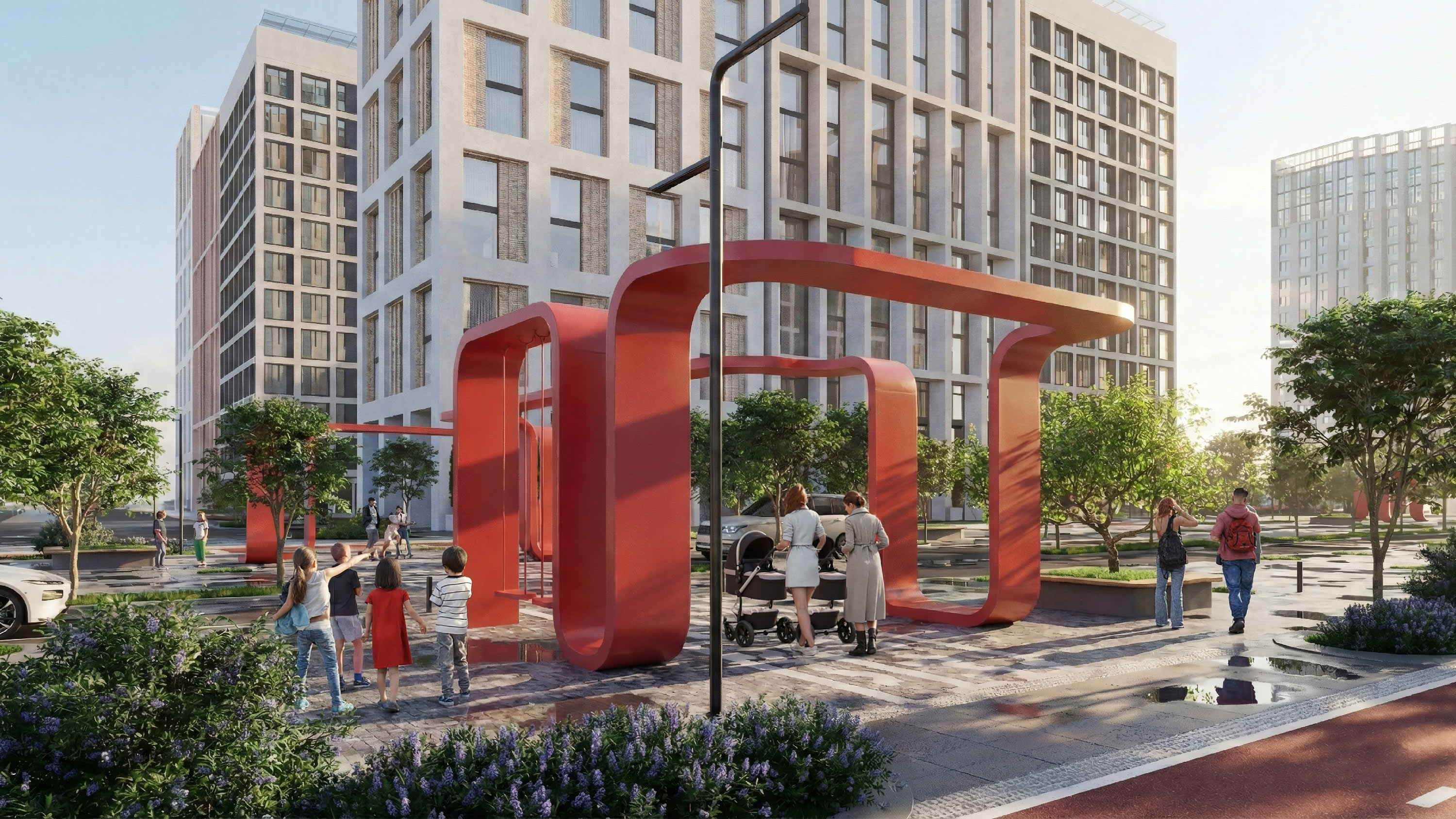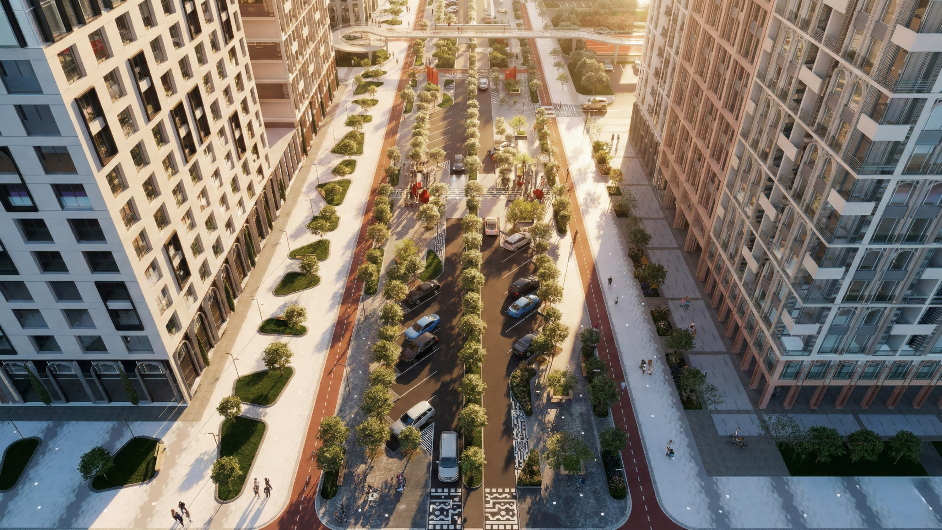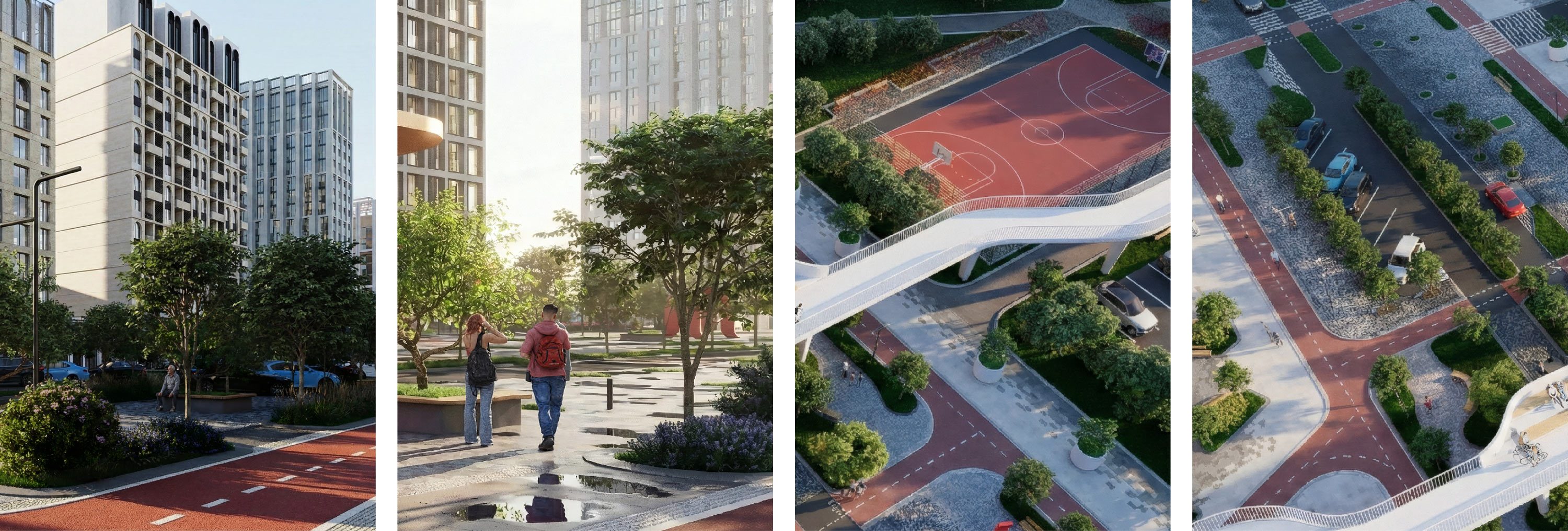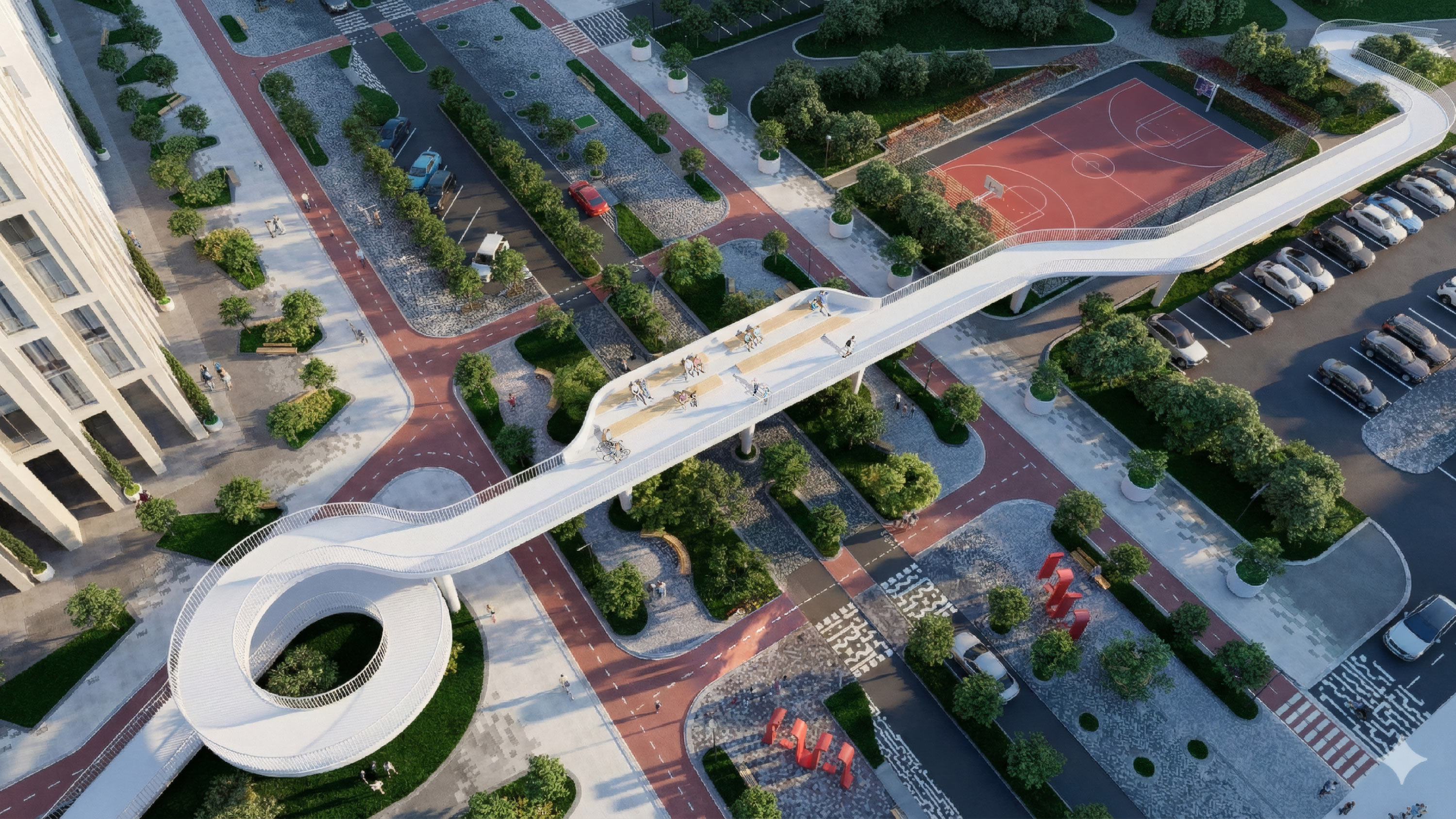 Главным акцентом становится пешеходный мост: возвышаясь над землей, он соединяет бульвар с «Зеленой рекой» и формирует законченный образ пространства.