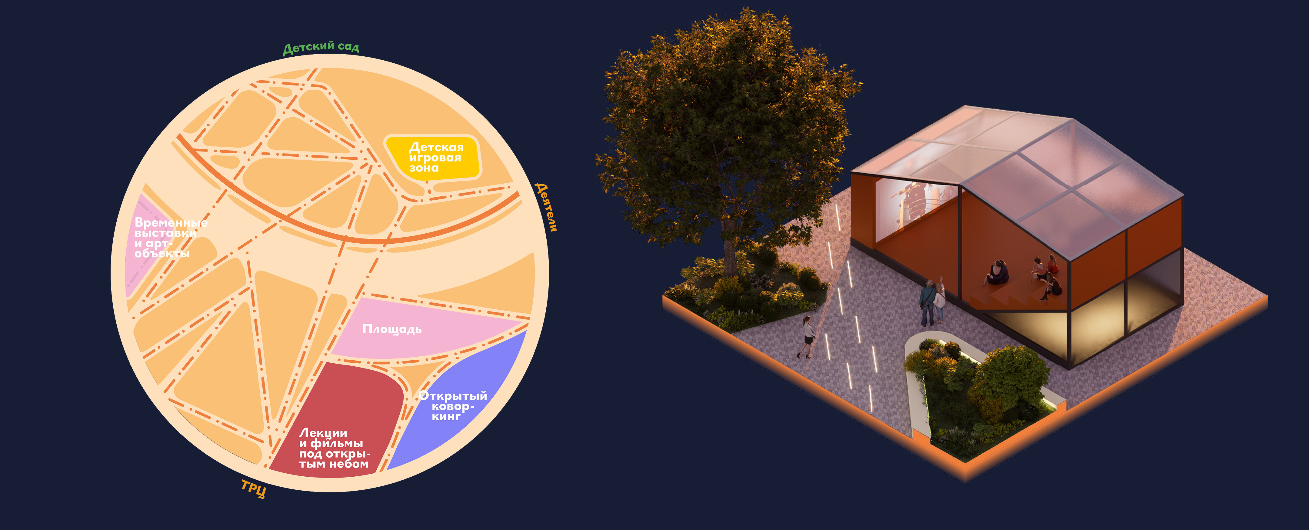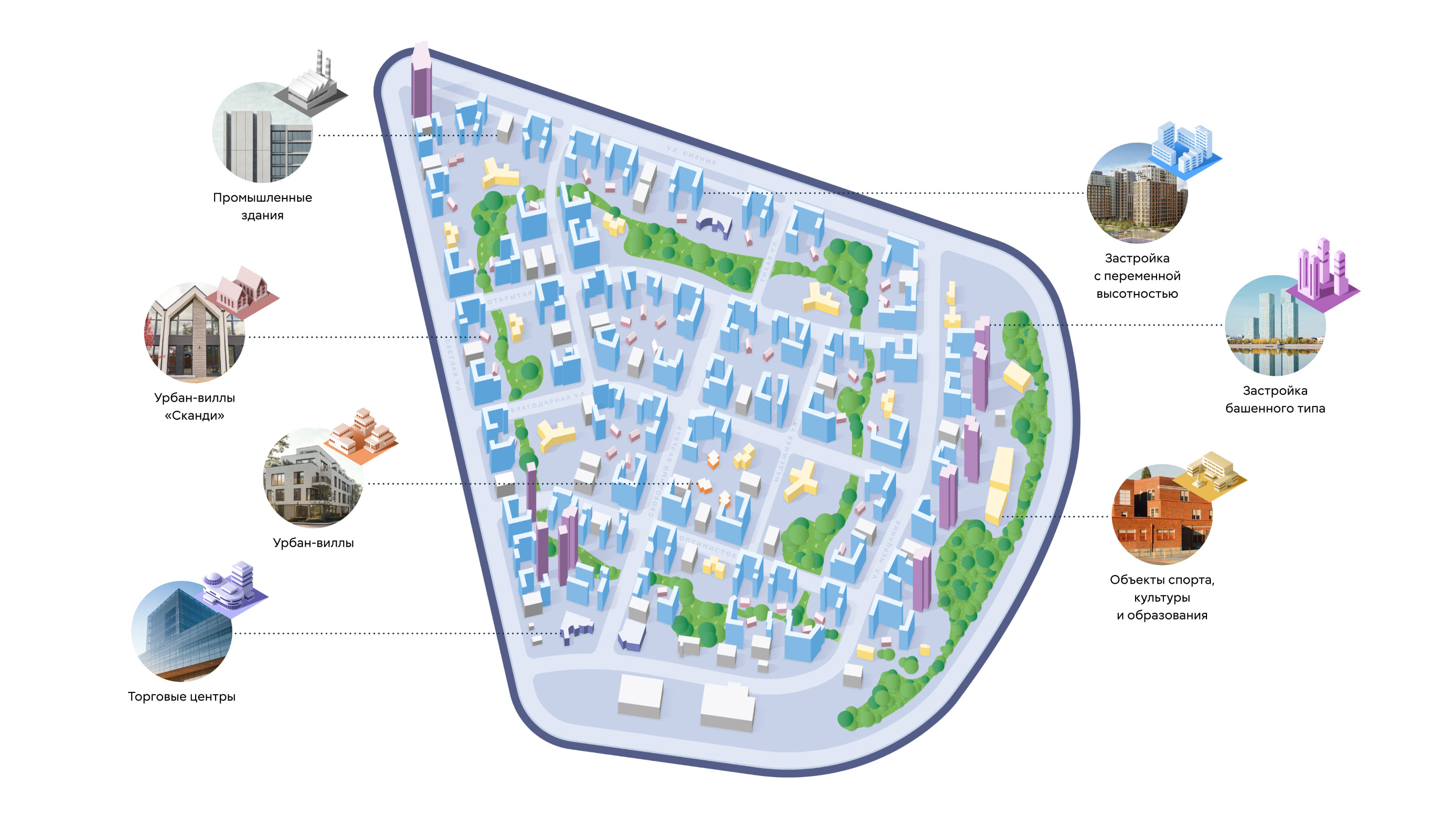 Территория развития образуется в средней части жилого квартала вокруг пространства для обучения, досуга и личностного роста.