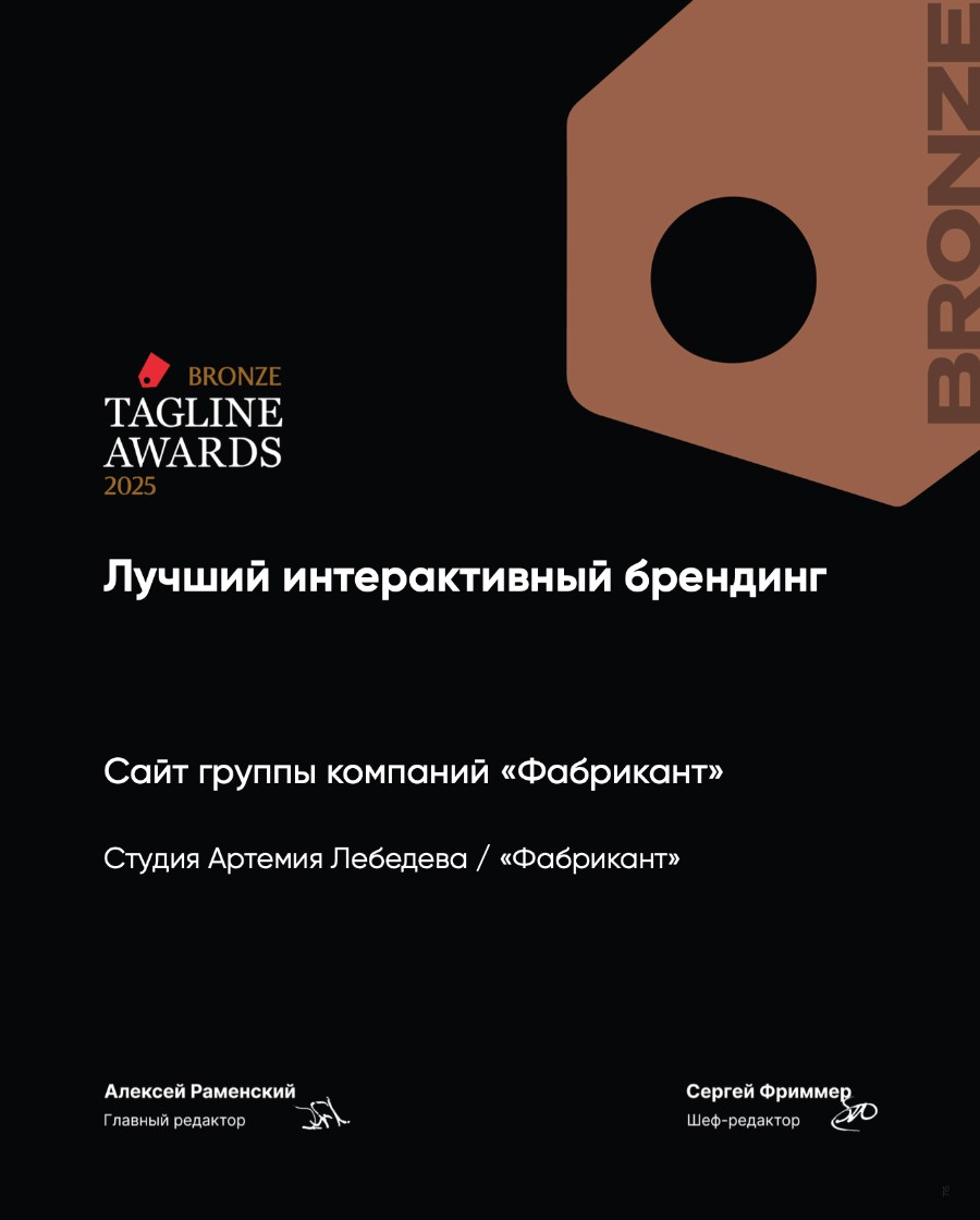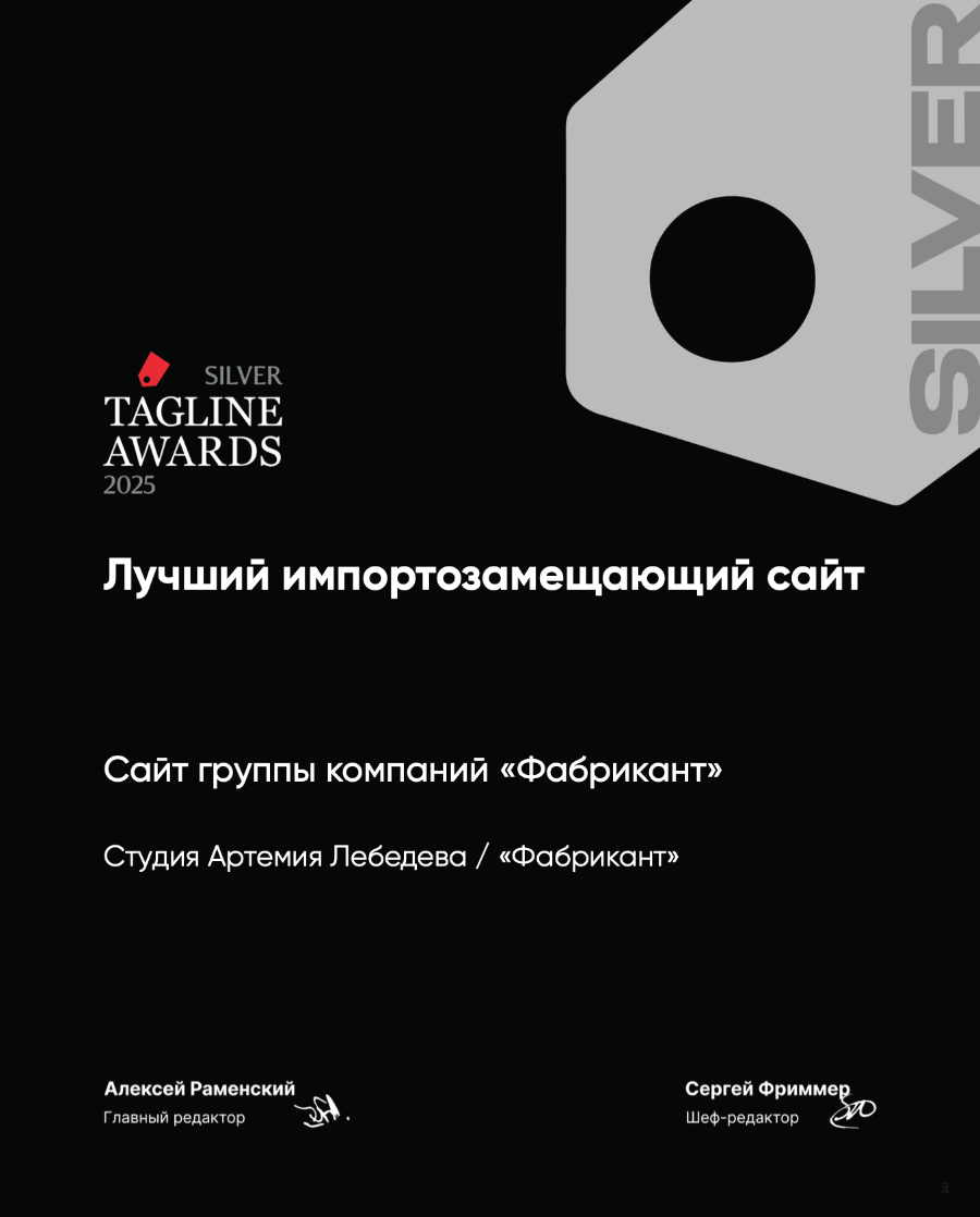 Логотип Сайт Рекламные плакаты 1.0 2.0 Награды за сайт группы компаний «Фабрикант» 2.0 Награды Описание Награды «Тэглайн эвордс» Декабрь 2025 «Тэглайн эвордс» Декабрь 2025 «Тэглайн эвордс» Декабрь 2025 «Тэглайн эвордс» Декабрь 2025 «Рейтинг рунета» Декабрь 2025