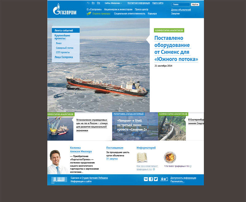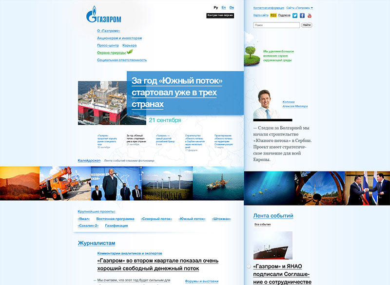 В результате доработок подход не оправдывает возложенных на него надежд. Внезапно приходит свежая скетч-идея — подойти ко всему более смело и опереться на результаты исследований. У нас слишком мало времени для того, чтобы задержать внимание зрителя. Отказываемся от «портянки» и делаем большие красочные скроллируемые баннеры из микса текущих новостей и крупнейших проектов «Газпрома».