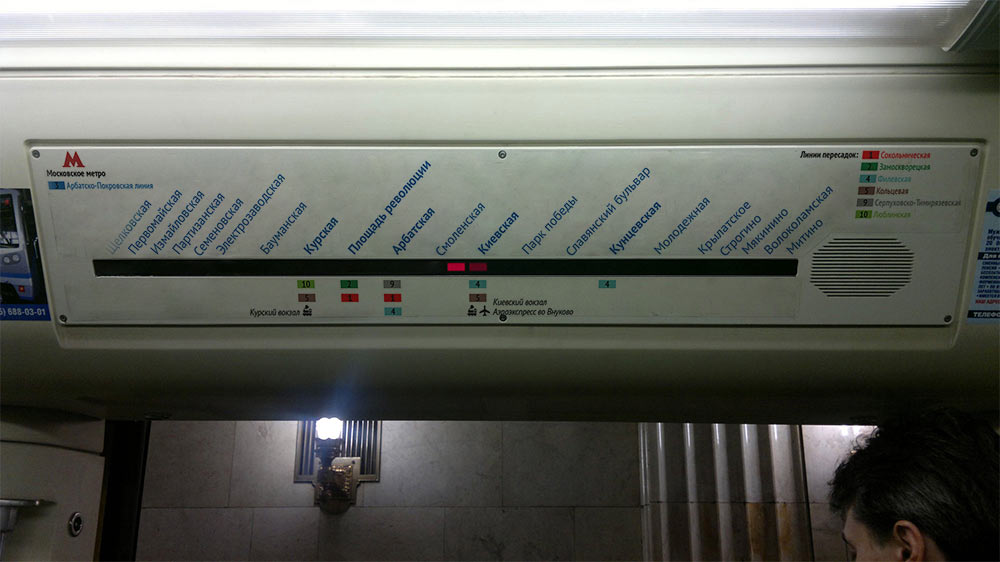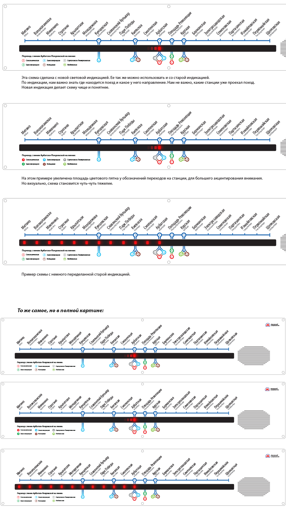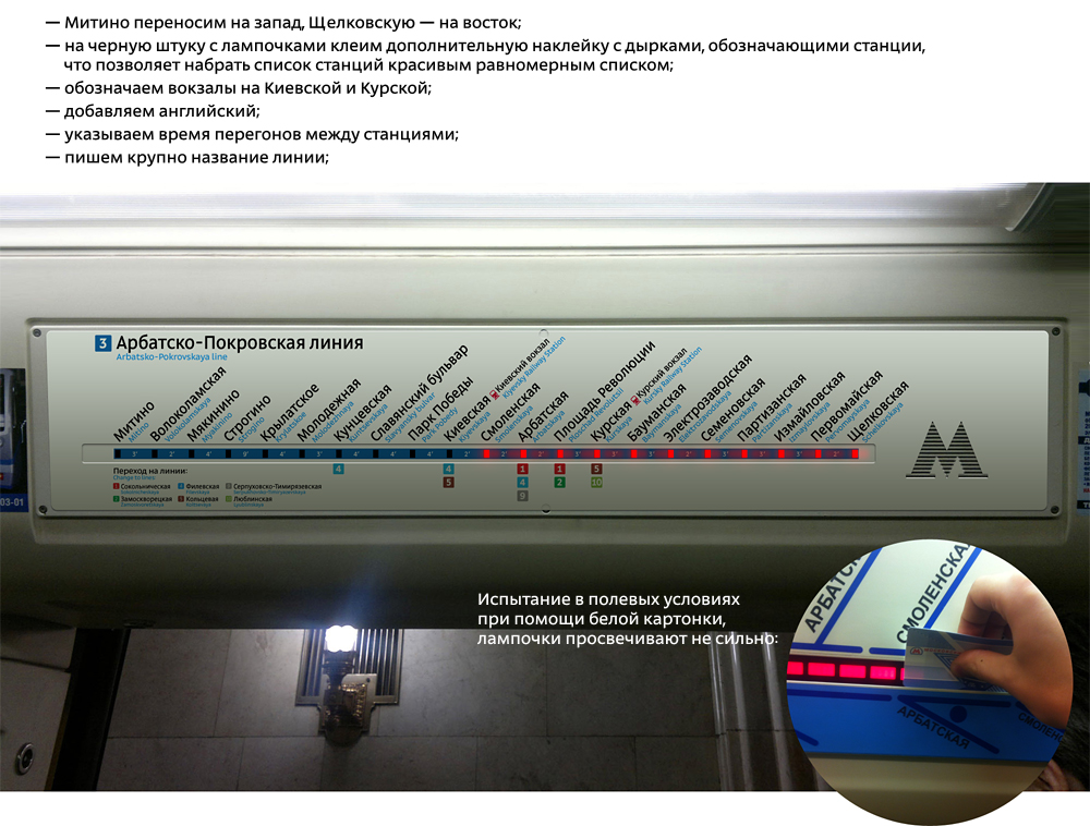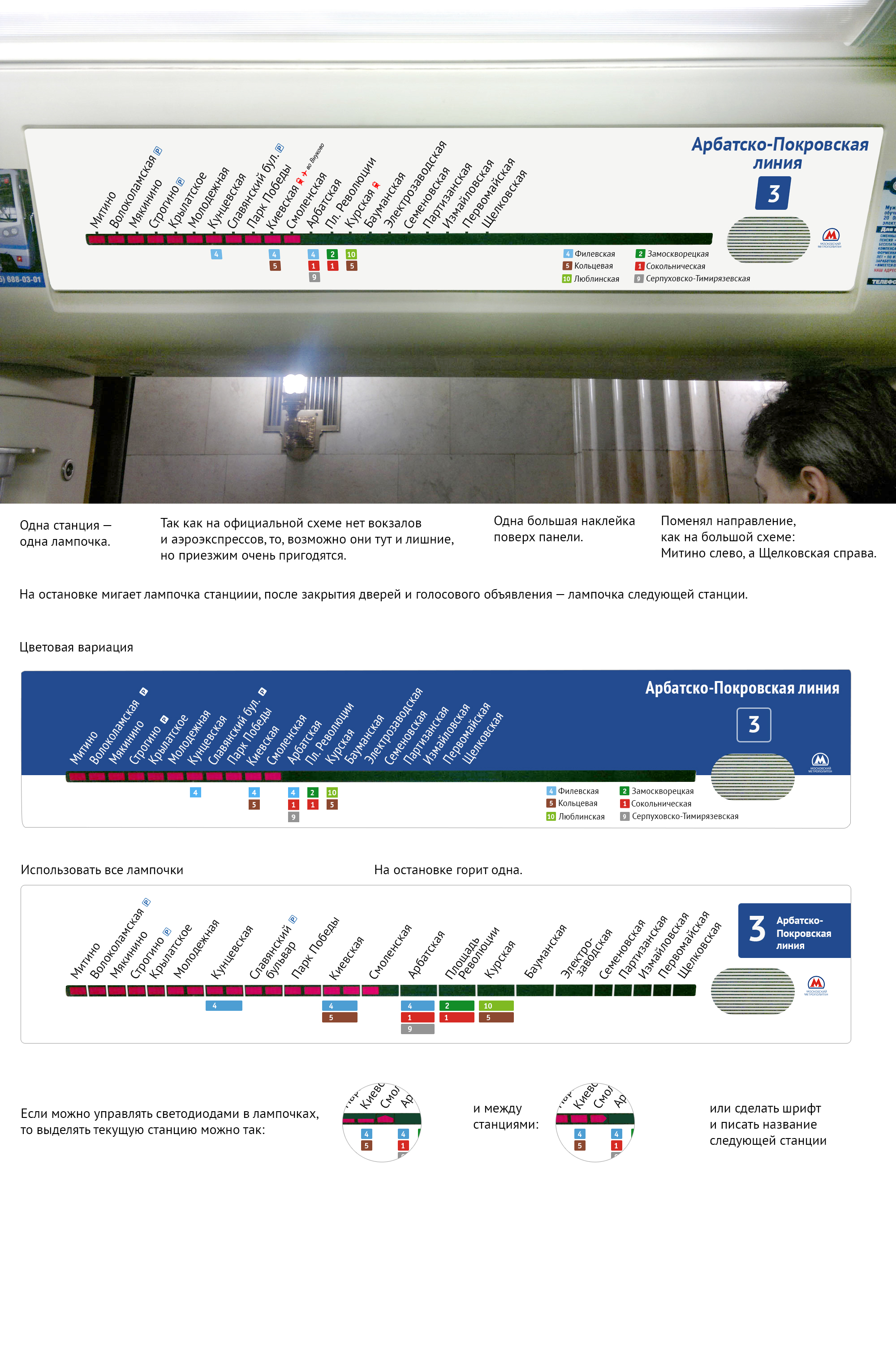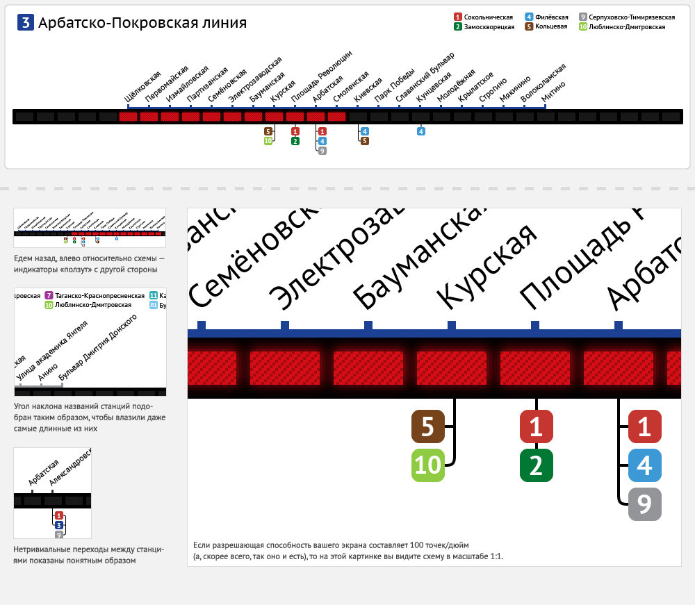 Самый большой плюс — отличное решение с индикацией движения. Жаль только, диоды нарисованы не в масштабе. Неплохое предложение по визуализации линии и пересадок.