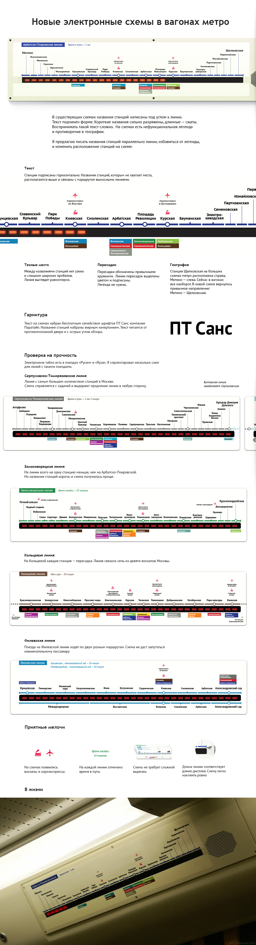 Чистая верстка, хорошая мысль отбросить ненужные лампочки. Понравилось, как показаны сложные пересадки. Жалко, что забыты вокзалы, это важная штука. Латиница тоже важна, однако некоторые авторы предлагали размещать две версии схем, поэтому не придираюсь.