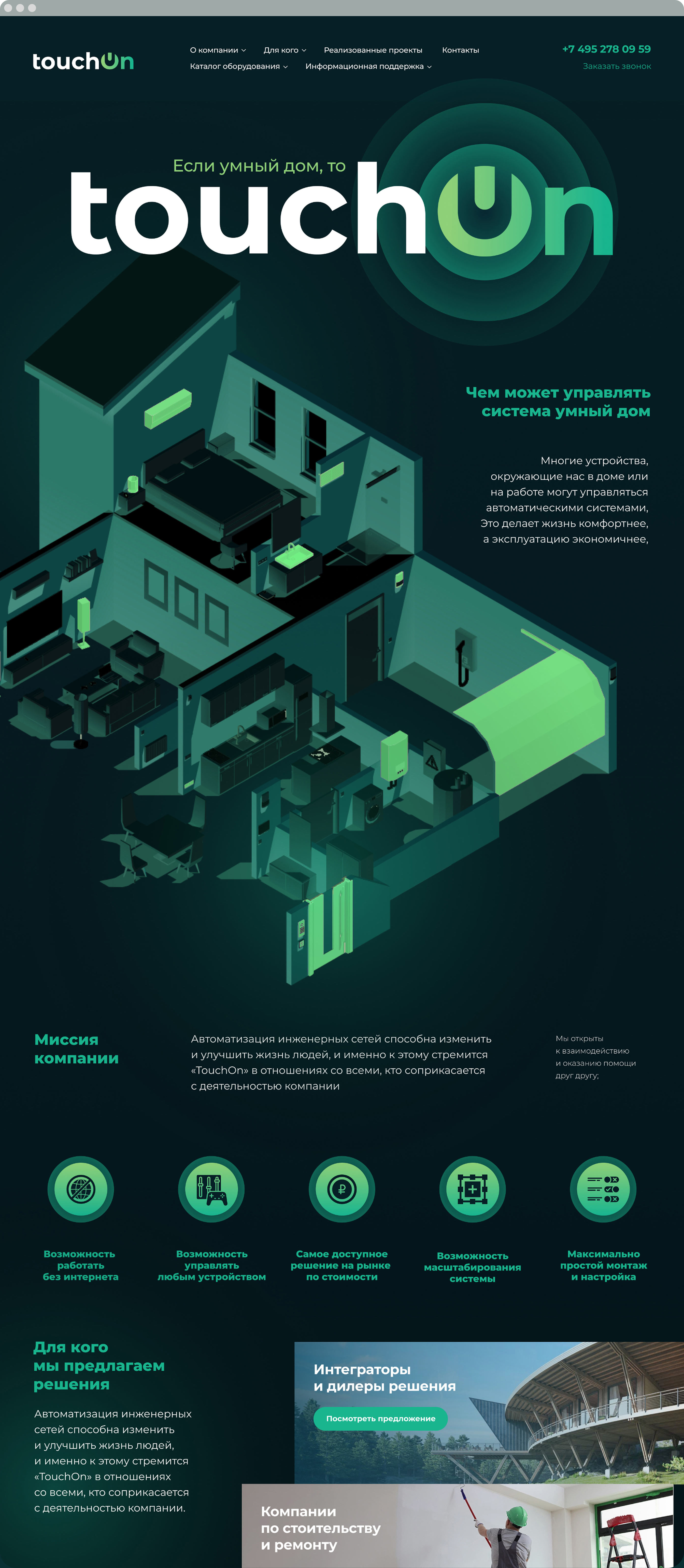 Главная задача сайта компании — привлечение надежных дистрибьюторов, внедряющих на своих объектах систему «умный дом» разработки «Тачон». Мы решили привлечь к диалогу каждую из целевых аудиторий с помощью каскада баннеров. При скролле создается иллюзия движения по лестнице.