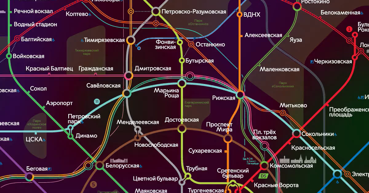 Плавные повороты линий делают схему свежее и поддерживают изгибы трех колец. Так созданная визуальная система лучше справляется с добавлением новых линий, станций и топографических объектов.