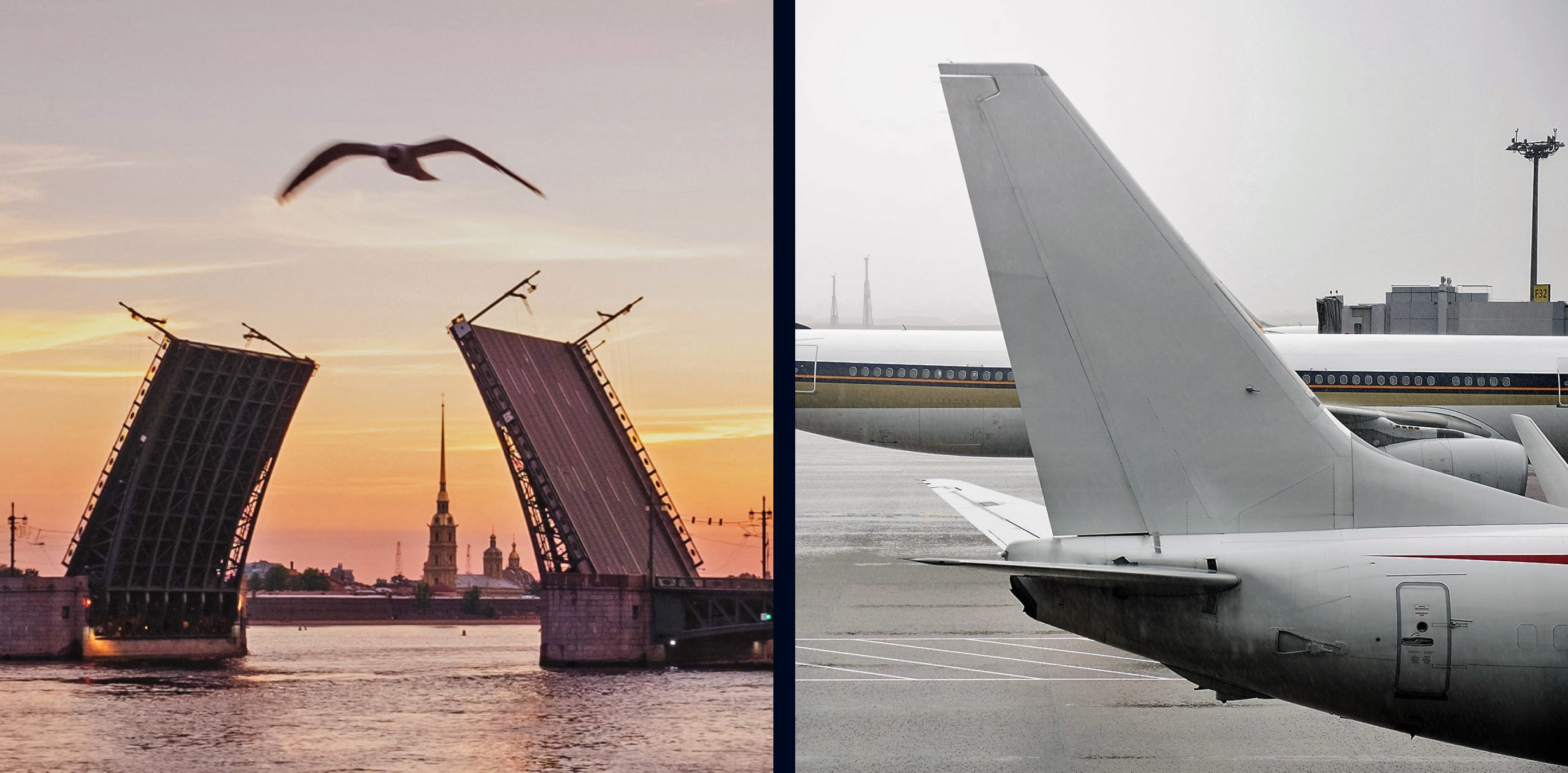 Графическая часть логотипа соединила два выразительных и очень узнаваемых образа: знаменитые разводные мосты Петербурга и хвосты самолетов.