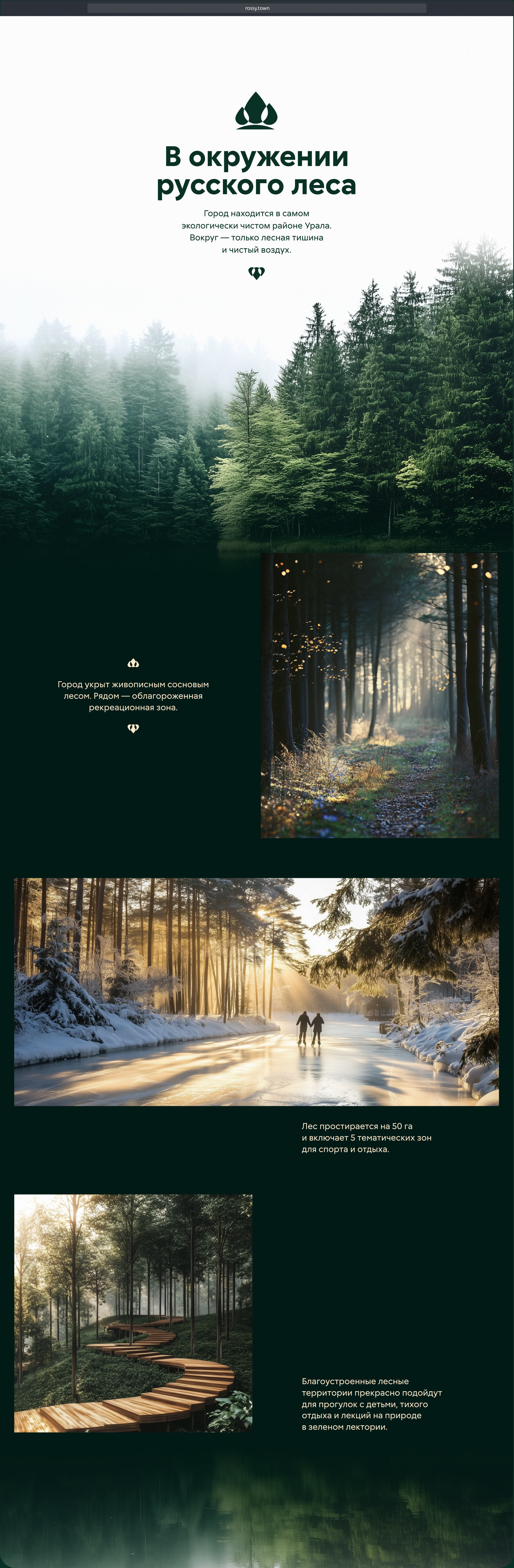 Тропинка приводит на берег реки, в которой отражается лес. Прием с отражением вообще активно используется на страницах: в логотипе, сочетаниях пиктограмм, оформлении текста. Изумрудно-белая цветовая гамма перекликается с уральской природой.